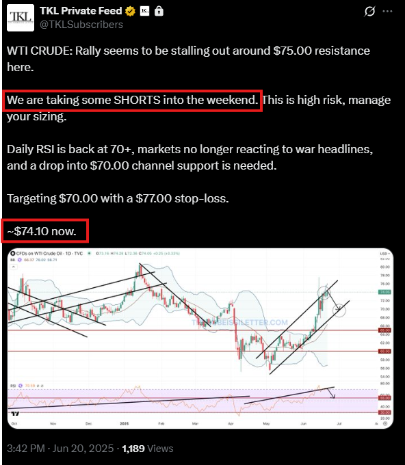 On Friday, we posted the below alert for our premium members. We took SHORTS in oil at $74.10 and called for a "sell the news" event. These shorts are now DEEP green as oil prices fall into $70.00. Subscribe to access our alerts below: http://thekobeissiletter.com/s...