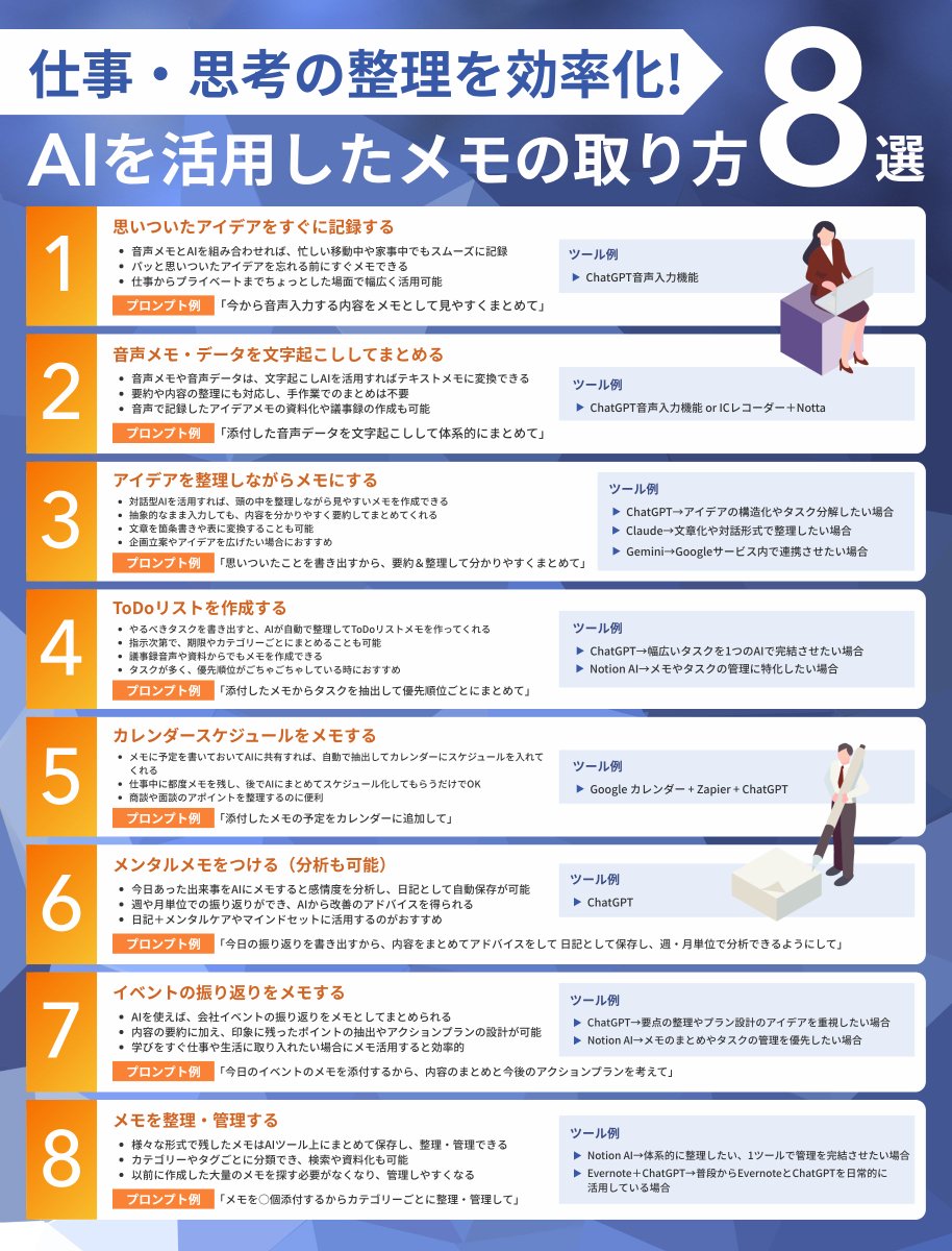 木内翔大@SHIFT AI代表「日本をAI先進国に」𝕏shota7180•View on XPublished: June 23, 20251459メモを整理できない、どこに書いたか分からない人はAIを使おう 仕事・思考の整理を効率化!AIを活用したメモの取り方8選: ToDoリスト化や予定管理まで幅広く任せられる。ぜひ使いこなしてみて↓