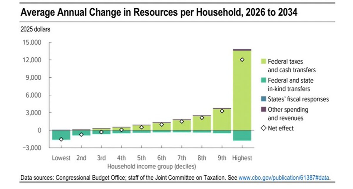 CBO estimates the bottom 30% will be worse off from Trump's tax bill (OBBBA) alone, mainly from spending cuts on Medicaid and food stamps (SNAP), worsening inequality as resources shift from poor to rich (a.k.a. Reverse Robin-Hood.) 2/