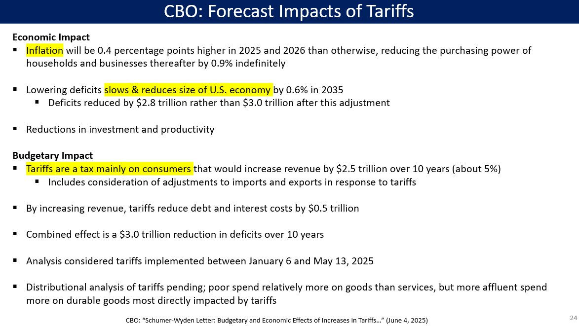 CBO on tariffs: 🔴$2.5 trillion tax increase on U.S. consumers. 🔴Inflation / price level up additional 1% overall by end of 2026. 🔴GDP growth slows slightly, resulting in economy (and incomes) 0.6% lower by 2035. 4/