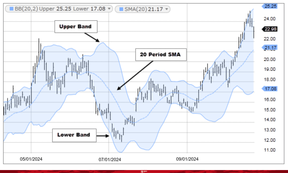 4. Bollinger Bands How to use: β’ When price touches lower band β Possible Buy β’ When price touches upper band β Possible Sell β’ When bands get very tight β Big move is coming soon A very simple breakout detection tool.