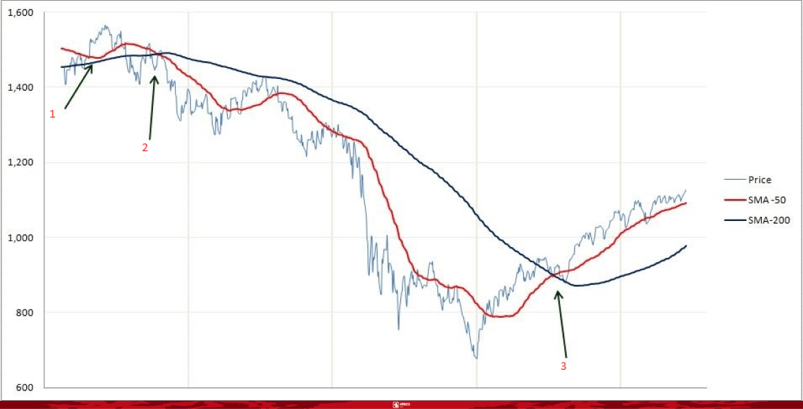 2. Moving Averages (MA) How to use: β’ Price above the 200-day MA β Uptrend (consider buying) β’ Price below the 200-day MA β Downtrend (consider selling) Also, look for Golden Cross (50 MA cross above 200 MA = buy) or Death Cross (50 MA cross below 200 MA = sell).