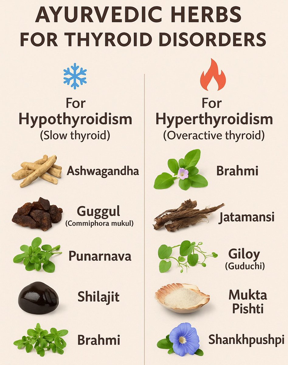 🔥 For Hyperthyroidism (Thyroid overactive): 1️⃣ Brahmi 🌿 Soothes nerves 🧠 Reduces anxiety & restlessness 2️⃣ Jatamansi 🌙 Natural sedative 💤 Helps with insomnia & nervous excitement 3️⃣ Giloy (Guduchi) 🛡️ Balances immunity ❄️ Cools down excess heat (Pitta)