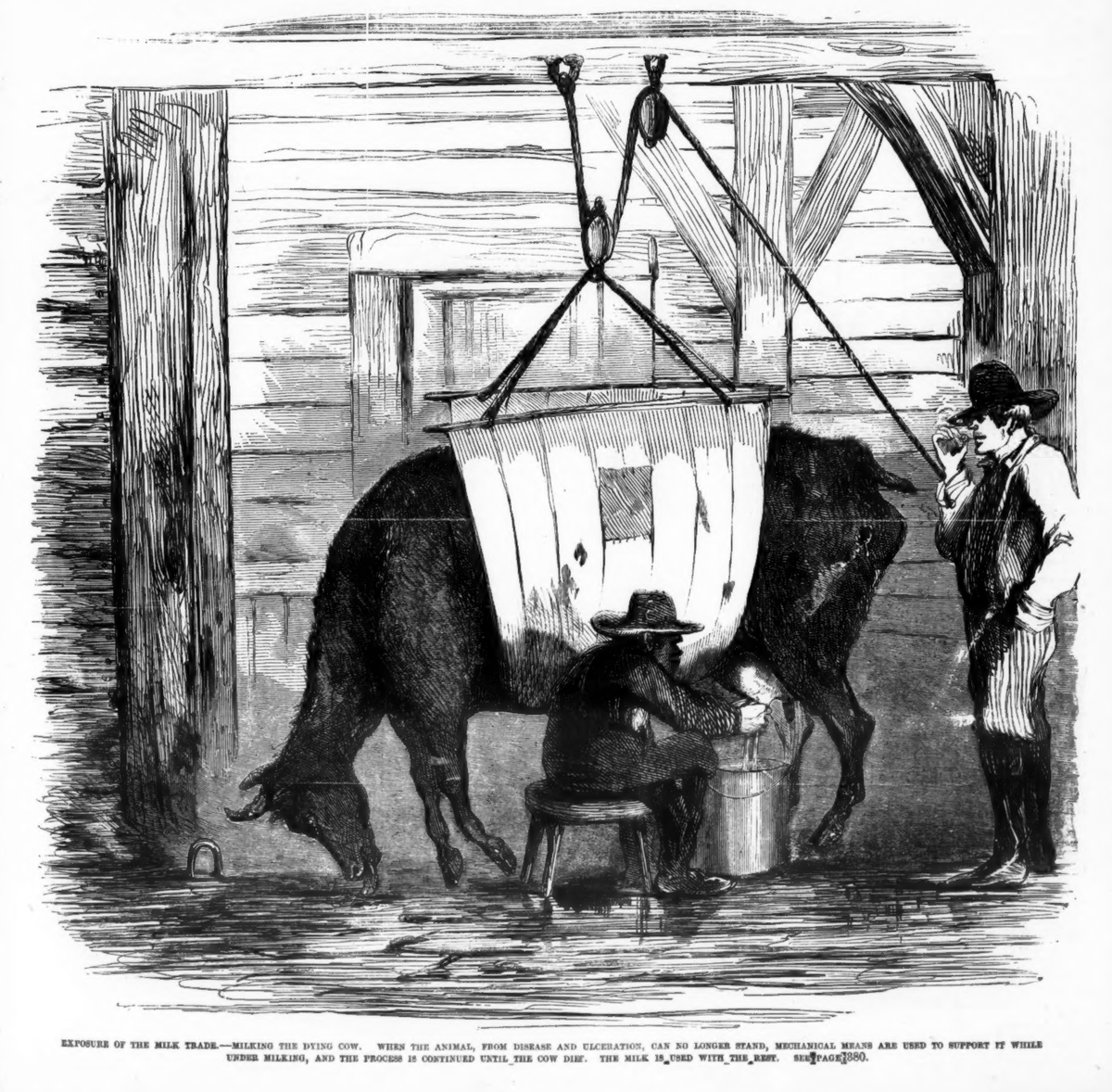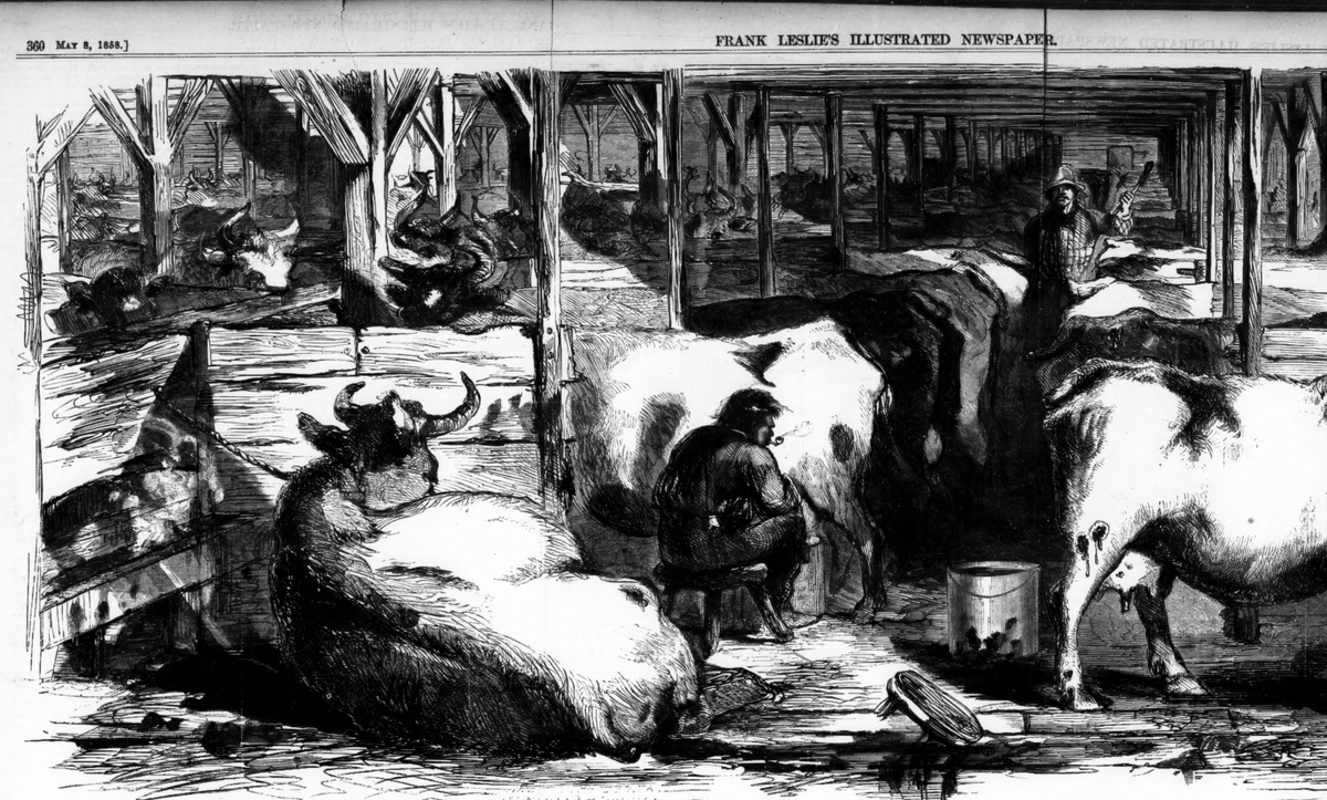 The cows in these "swill" stables were diseased and sick, often unable to stand. They'd use cranes to lift them off the ground so they could continue milking them, even as death was near. Infants drinking the "swill" milk began dying by the thousands each summer. Yes—thousands.