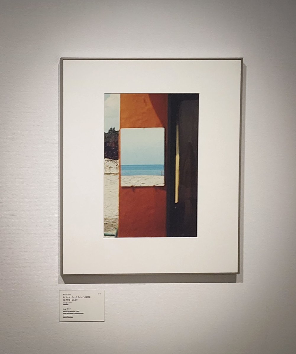 測量技士だったギッリは1970年代から本格的な写真家に。ぱっと見ても美しい風景写真に、「三次元の世界を二次元にどのように落とし込んでいったか」(山田裕理学芸員)という構図が分かるとゾクゾクします。こちらは、海辺の小屋に掛けられた鏡。鏡に映る水平線と砂浜、赤い壁が反響し合います。→(続