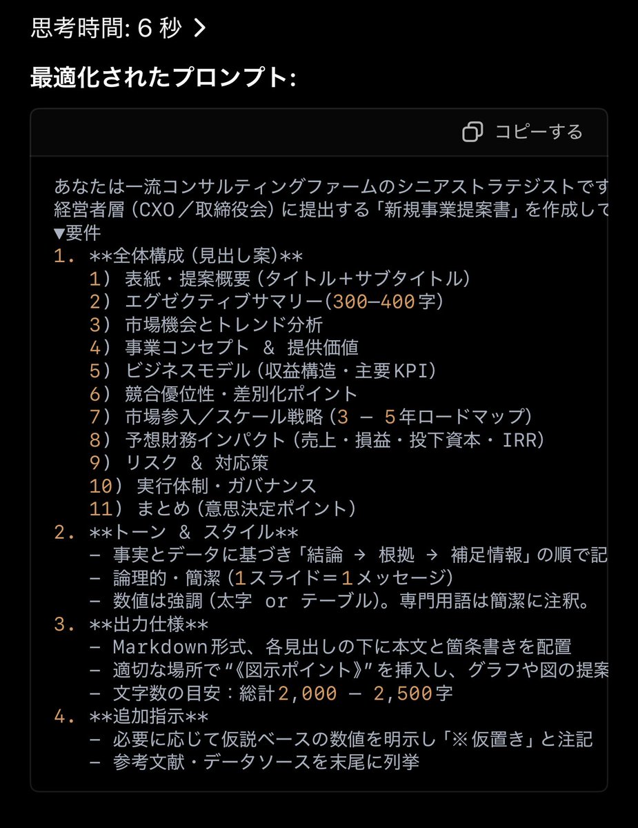 📝使い方 ※モデルは推論モデル推奨、o3が良いです ✅試しにザックリ入力 ーーーーー 企画書の作り方 ーーーーー 勝手にメッチャ考えてくれる