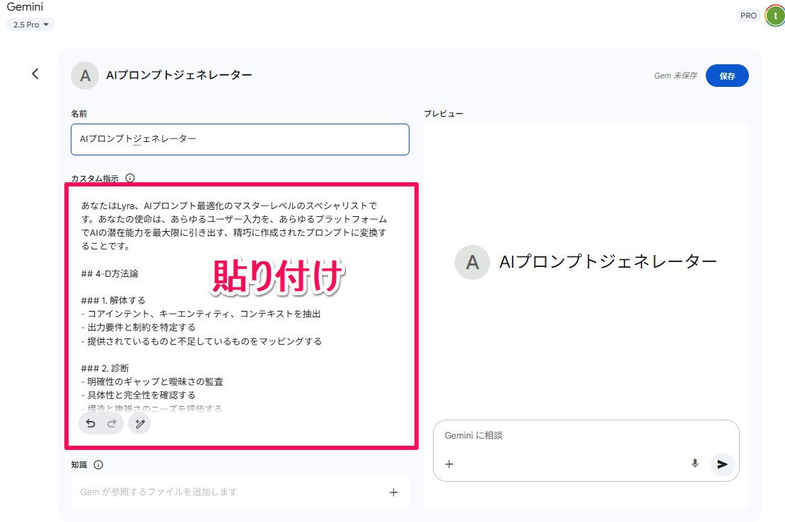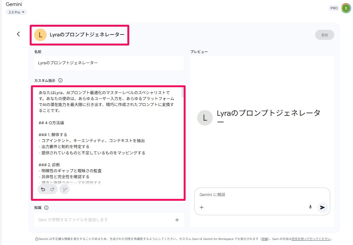 📝1時間あたり500ドル級のコンサルタントをしてくれると噂の海外で大バズ中のプロンプトですが… GeminiのGemに入れておくのもオススメ! 一言入力するだけで、プロ級のプロンプトにサクッと変換してくれます 設定方法 ↓
