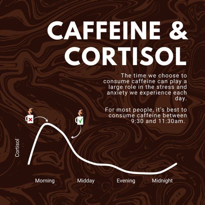 ۳) مصرف کافئین رو عقب بنداز قهوه خوردن با شکم خالی یعنی یه بمب کورتیزول تو بدن! بدنت فکر میکنه تو شرایط خطر هستی. اول یه چیزی بخور، بعد قهوه رو بزن کافئین رو ۶۰ تا ۹۰ دقیقه بعد از بیدار شدن بخور بعد از ساعت ۲ ظهر هم دیگه قهوه نخور