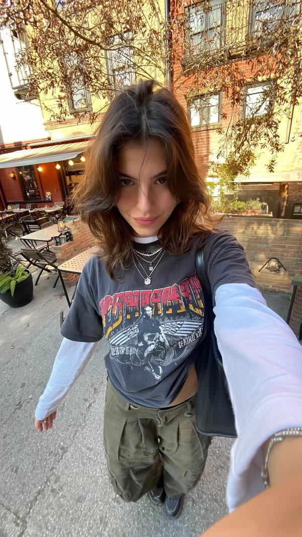 prompt: "A playful, relaxed wide-angle iPhone selfie captured from a distinctly elevated overhead perspective portrays a young woman gazing directly into the camera with a genuinely neutral yet engaging expression. Her softly tousled hair frames her face, strands naturally