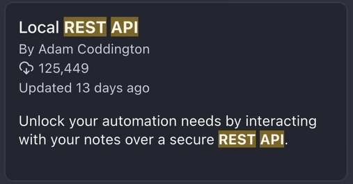 3️⃣ Obsidian REST API の設定 Obsidianを開く ↓ 設定を開く ↓ Community plugins ↓ Blowseから「rest api」と検索 ↓ インストールして有効可 ↓ OptionからAPIキーをコピー ↓ Claudeで設定したコードの "OBSIDIAN_API_KEY": "<your_api_key_here>” にAPIキーをペースト ↓ 再度、Claude