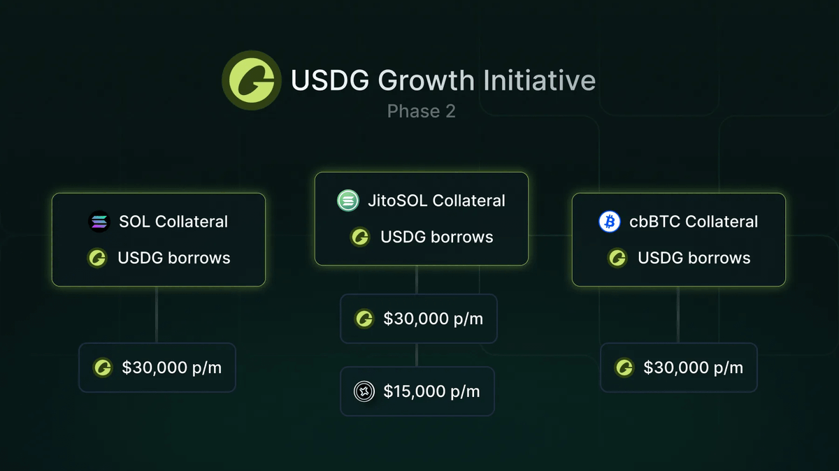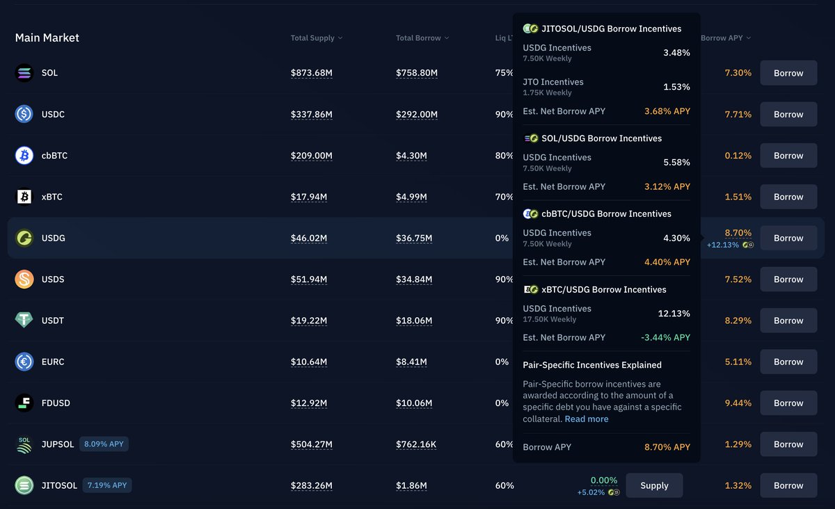 6/ USDG incentives go beyond classic emissions—they’re aligned with ecosystem growth USDG is the most cost-efficient asset to borrow against SOL, jitoSOL, cbBTC, and xBTC In fact, borrowing against xBTC (issued by @okx) currently yields a –3.5% APY. You get paid to borrow $USDG