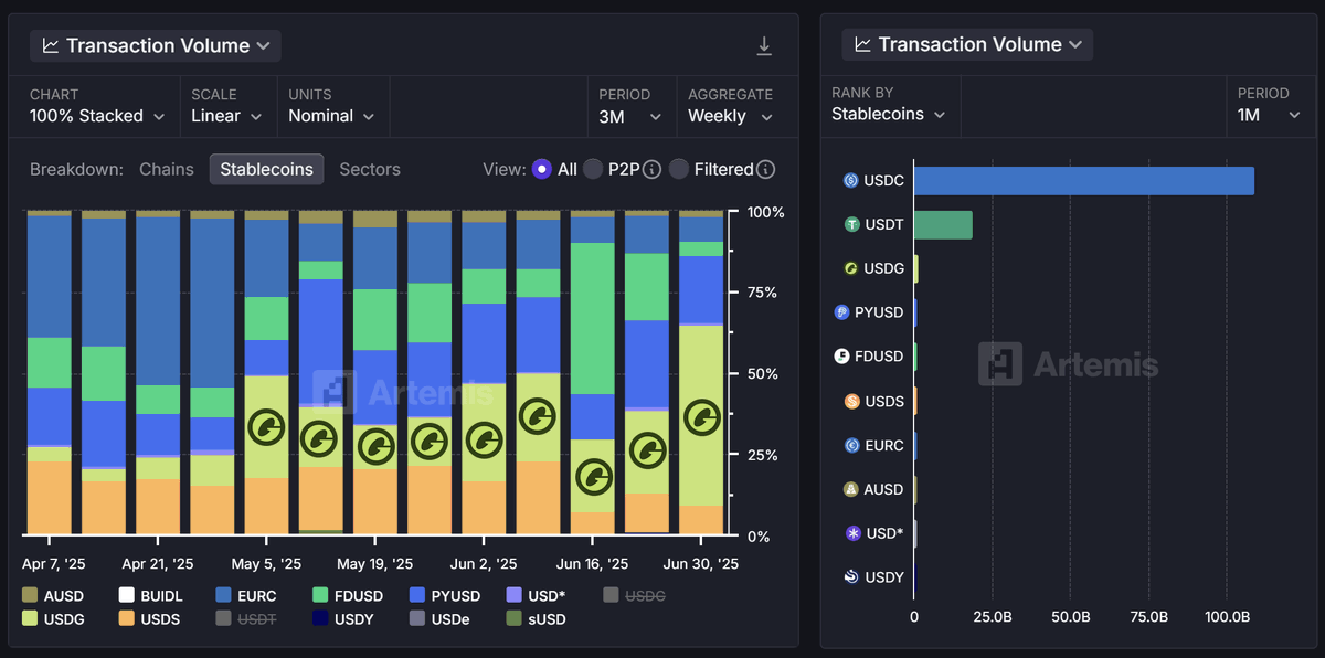 8/ We mentioned earlier that $USDG ranks as the 6th largest stablecoin on Solana However, with true usage metrics like txn volume, $USDG has actually claimed the #3 stablecoin spot, sitting below only USDC/USDT over the last month This traction is powered by the full Kamino