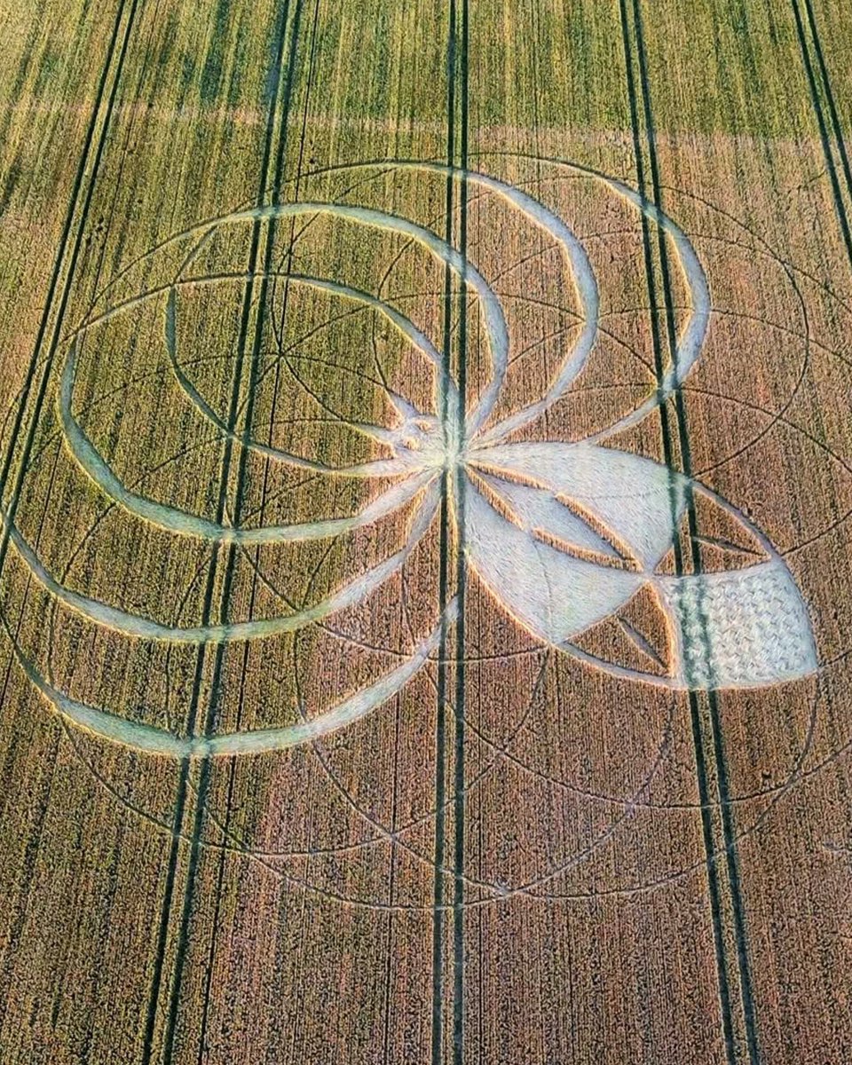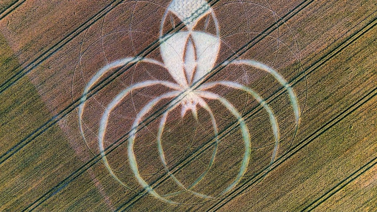 🌾Crop circle – July 10, 2025 📍 Cerne Abbas Dorset Appeared in a wheat field, this mysterious shape looks like a giant spider… But if you look closely, it also resembles an alien face 👽 🕸️ What does a spider do? It weaves a web — delicate, invisible, but deeply connected.