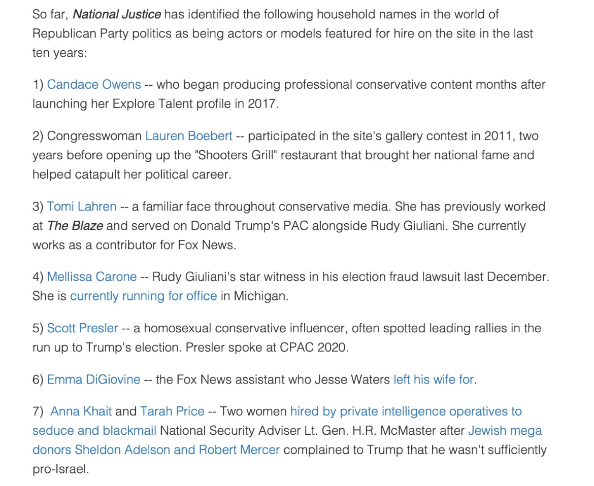 Explore Talent was started by Israeli pornographer and tech entrepreneur Amiram Shafir. Other prominent conservatives promoted by Explore Talent are below. By the way, the private investigator who hired Khait and Price in number 7 was Erik Prince. Quite the weird network.