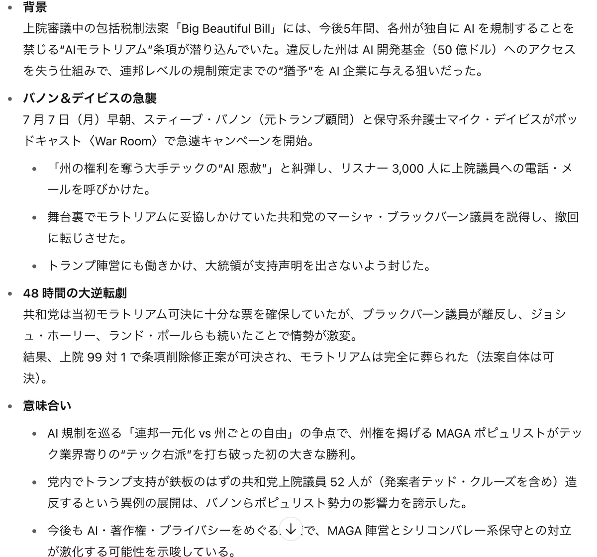 これは大きすぎるニュース!!!今までトランプ政権はAI加速でテック右派とMAGAが共同戦線のように見えてたが決裂。AI加速法案(モラトリアム法案)が成立しかけていたが全会一致でギリギリ否決された。技術の加速ではなく、「アメリカという国と国民」をMAGAは重視する。