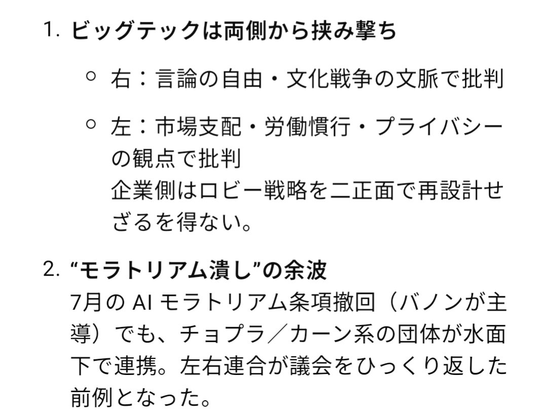 ちなみに今回のモラトリアム法案否決で分かったのはテックとMAGAに元々あった亀裂がAIという文脈でも今回大きくある(ほぼ全会一致の否決)ことが確認できたことが大きい。一方でAI開発の加速自体が現時点で遅くなるとか投資がされなくなるとかではなく特に今までと変わらないことには注意が必要。