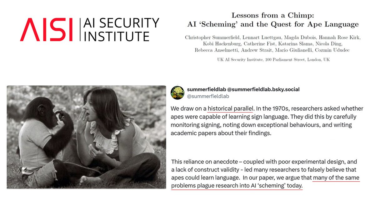 In this new paper, the UK AISI researchers draw a historical parallel to previous excitement about "the linguistic ability of non-human species." "The story of the ape language research of the 1960s and 1970s is a salutary tale of how science can go awry." "There are lessons to