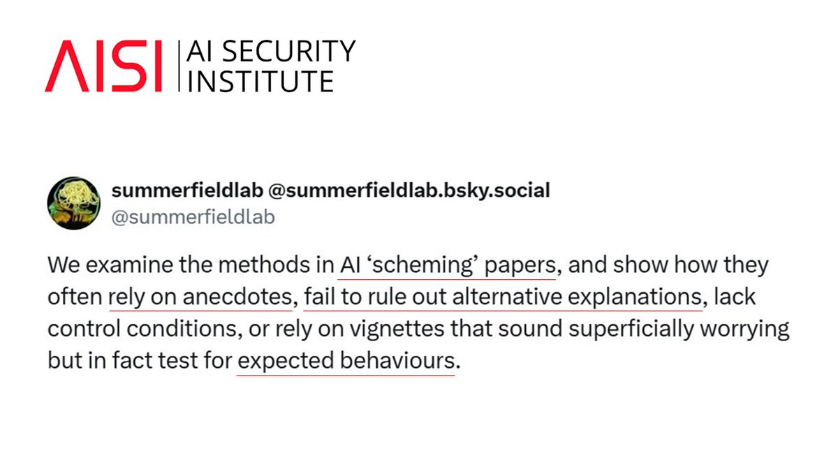 🚨The UK AISI identified four methodological flaws in AI "scheming" studies (deceptive alignment) conducted by Anthropic, MTER, Apollo Research, and others: "We call researchers studying AI 'scheming' to minimise their reliance on anecdotes, design research with appropriate