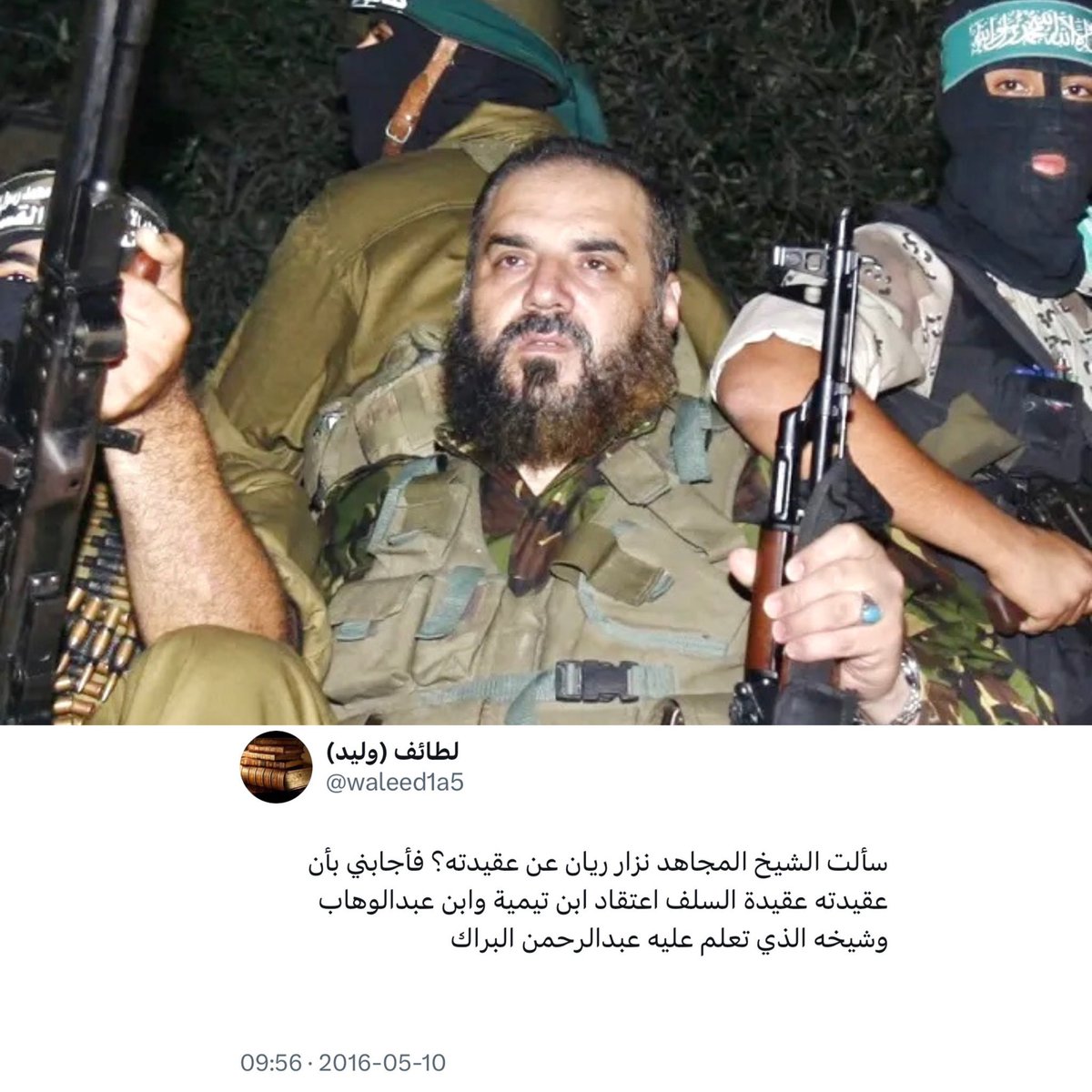 Nizār Rayān, a leading Palestinian Mujāhid martyred in 2009, said that he was upon the ʿaqīdah of Ibn Taymīyyah, Muḥammad Ibn ʿAbd al-Wahhāb, and his teacher ʿAbd al-Raḥman al-Barrāk.