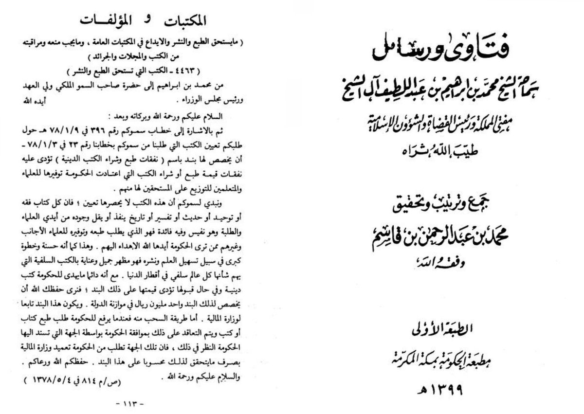Muftī Muḥammad Ibn Ibrāhīm Āl al-Shaykh ordered the Saudi king to fund 1 million riyals towards the printing of Islāmic books. • Muḥammad Ibn Ibrāhīm said: ❝May the peace, blessings, and mercy of Allāh be upon you. To proceed: With reference to your Highness’s letter No.