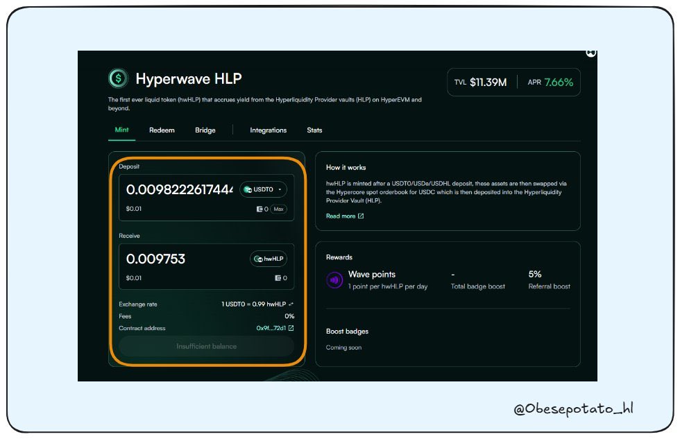 4/ @Hyperwavefi Deposit USDtO into Hyperwave → Mint hwHLP (Hyperwave LP token) → Borrow on felix steps~ https://x.com/Obesepotato_hl/s... https://app.hyperwavefi.xyz/hy...