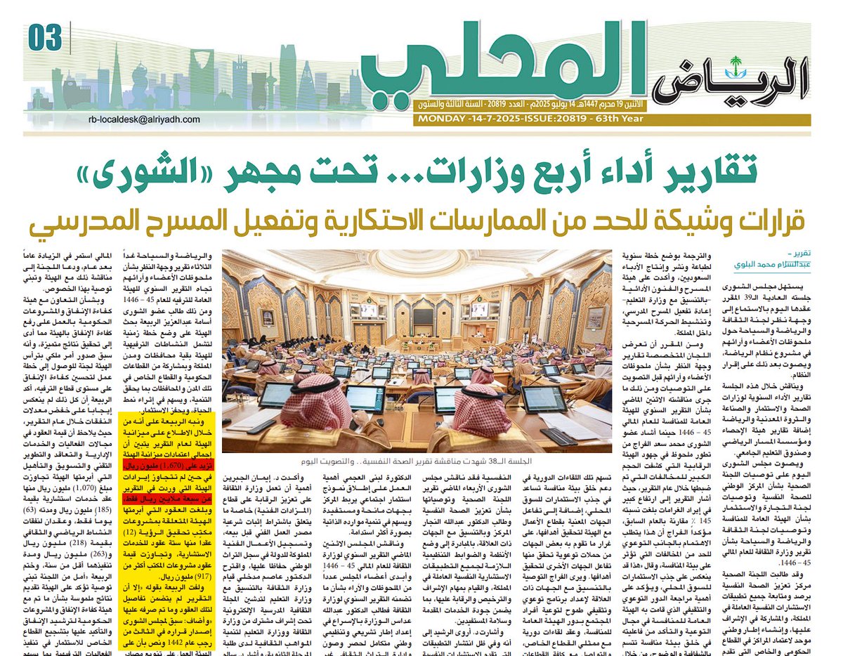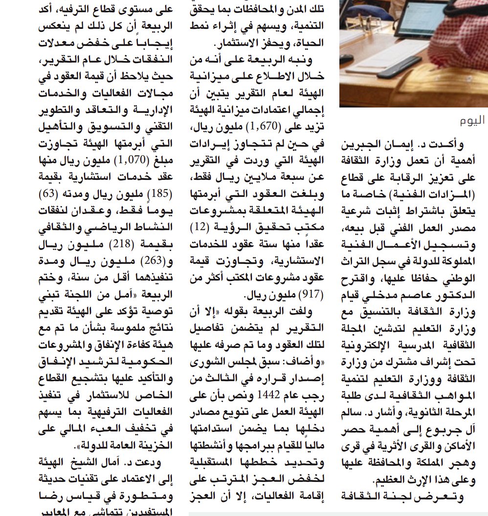 صحيفة الرياض يوم الإثنين مصاريف 1670 مليون ريال إيرادات أقل من 7 مليون ريال تعاقد مع شركات استشارية ب 917 مليون ريال في سنة واحدة (فساد صريح) المعني بالشركات الإستشارية هم السب كونتراكتورز اللي يتعاقدوا مع المشاهير والعاهرات عضو مجلس الشورى مستغرب من هذا التباين!