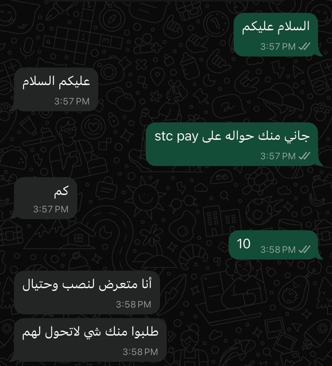 🔎 الهدف الحقيقي: عندما تكسب المجموعة ثقتك، يطلبون منك تحويل مبالغ أكبر، وعند الوصول لمبلغ كبير بما يكفي، يسحبون المال بالكامل ويختفون، أو يسيطرون على حساب STC Pay الخاص بك ويستخدمونه للاحتيال على الآخرين.