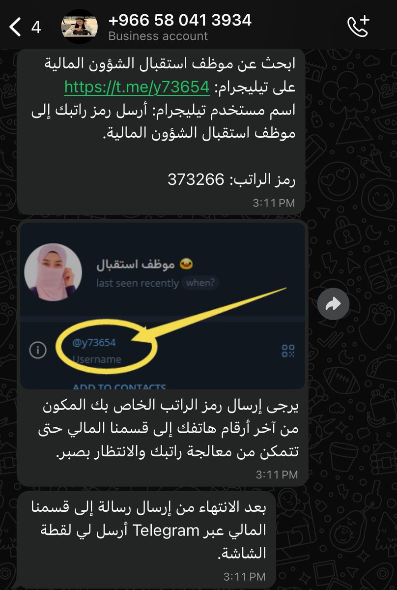 3️⃣ في واتساب، يبدأ المحتالون بالتحدث عن تفاصيل لوظيفة وهمية سهلة ومرنة من المنزل. ومن أول الأسئلة التي يطرحونها عليك: “هل لديك حساب STC Pay؟” بزعم استخدامه لاستلام “الراتب”.