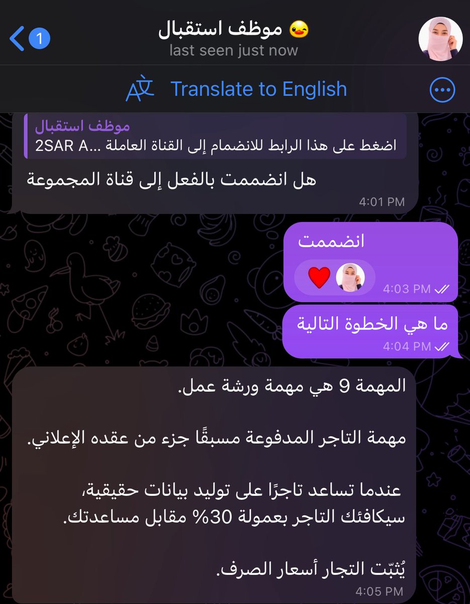 5️⃣ بعد ذلك يتم توجيهك إلى “موظف استقبال” مزعوم على تطبيق تليقرام لمتابعة إجراءات الدفع الوهمية.