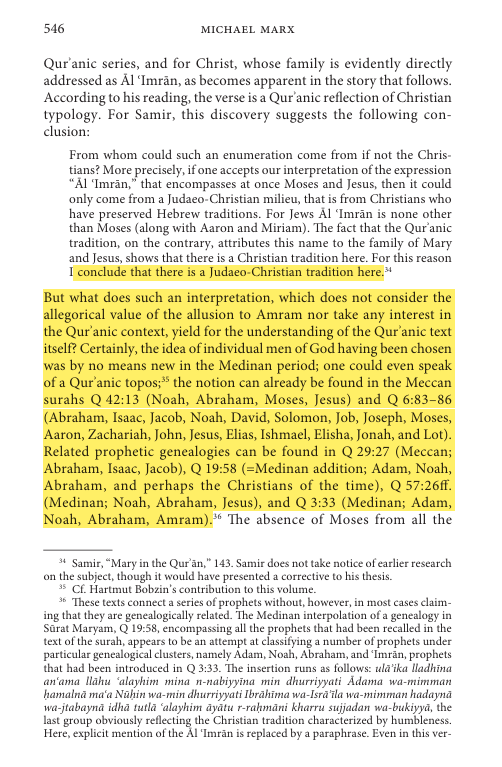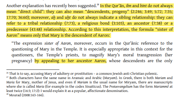In Michael Marx's chapter, Arabic phraseological convention of using terms like ukht (sister) or bint (daughter) refers to membership in a group or lineage at least in this case. The Qurʾan consistently links Mary to an Aaronid genealogy, weirdly this is something not found in