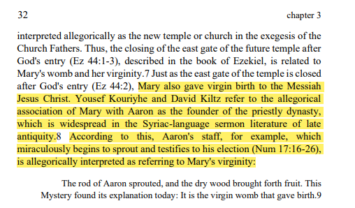 According to Zishan Ghaffar, Aaron's staff, for example, which miraculously begins to sprout and testifies to his election (Num 17:16-26), is allegorically interpreted as referring to Mary's virginity ( (Yousef Kouriyhe, David Kiltz, Hymns on the Birth of Jesus (De Nativitate)