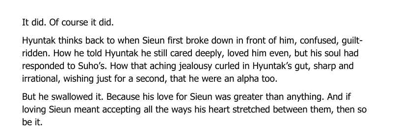 Suho hums again, quieter. “It must’ve been confusing for you.” “What was?” “You’ve known Sieun longer,” Suho says. “Then suddenly he’s got a mate you’ve never seen before. Me. I figured it threw you off.”