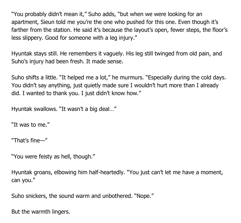 Hyuntak doesn’t say anything, but something stirs in his chest. Something stupidly fond. Maybe it’s the intimacy of this moment. Maybe it’s the fact that waking up like this, in Suho’s room, wrapped up in Suho’s arms, feels more intimate than anything they’ve ever shared.