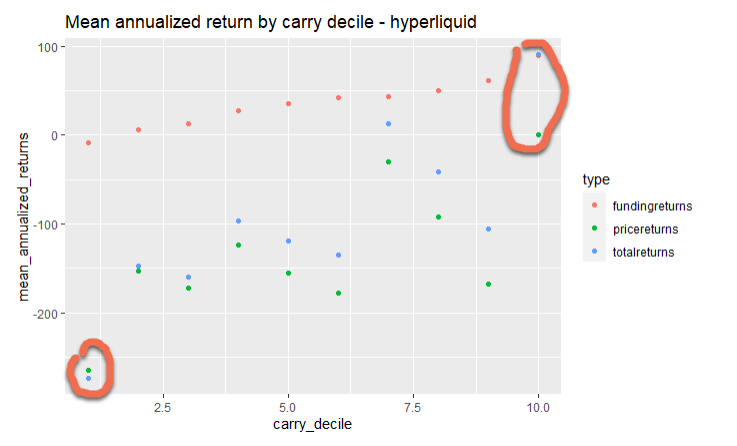 Take a 3 day average of funding (you'd do a 2 or 1 day if you had good execution, but lets assume you suck because you probably do) Split those results into 10 chunks, (deciles) And measure against next day log returns /5