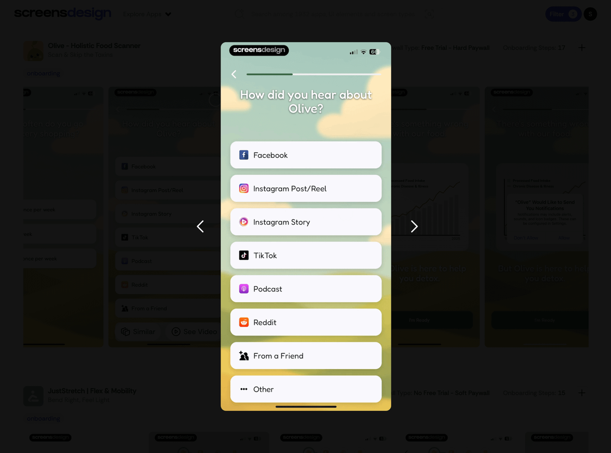 Olive's "How did you hear about us?" screen can help optimize their ad spend. This data tells them which channels are driving installs. Pro tip: If you implement this, randomize the order of the options so that every user is going to see a different order 7/19