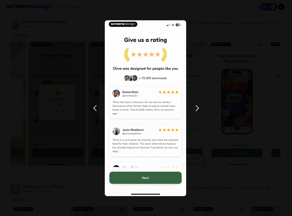 Olive has a three-step paywall: First, they show you the product in action with a video. Then, they remove the fear of commitment with a reminder promise. Only then do they show you the price, full of social proof 13/19