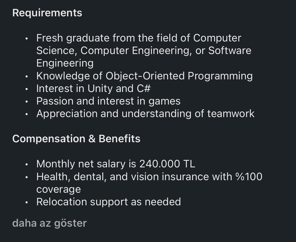 @DoanDadelen5 Sadece cvye geri dönüş şartı bilkent odtü boğaziçi itü mezuniyeti artı oyun geliştirme tecrübesi