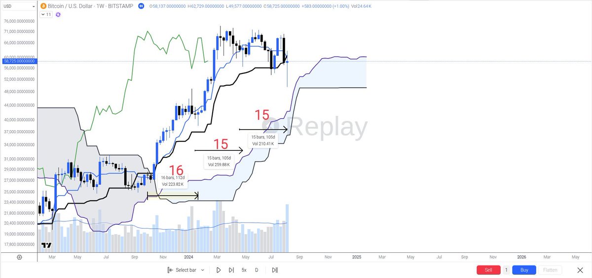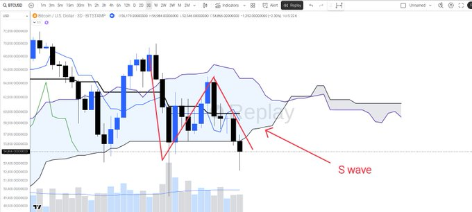 10 / 13 Here is a practical example of how to use the Wave Theory in a combination with the Time Theory. On the 9th of July 2024, at 53K, I posted a scenario which I subsequently posted that becomes my primary scenario, that $BTC should have one dead cat bounce on the