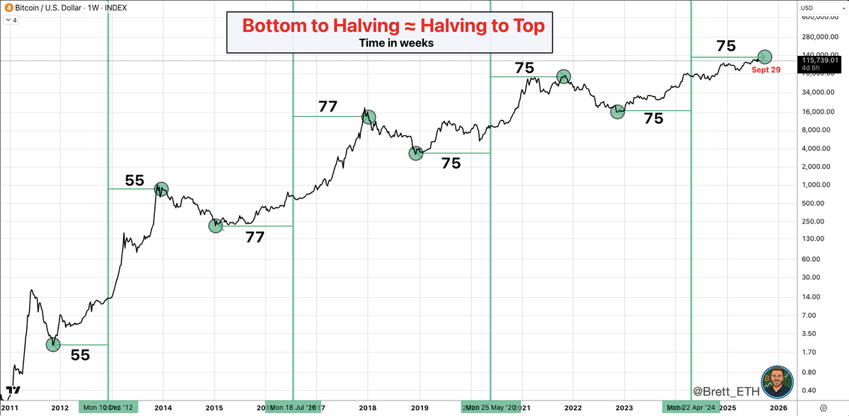 Bitcoin’s bottom-to-halving time ≈ halving-to-top time. The previous bottom was 75 weeks before the having. 75 weeks after the 2024 halving is September 29, 2025. The kicker? The halving-to-top is typically a few weeks shorter than the bottom to halving... This time will be