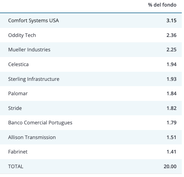 Composición de Cartera: Top 5 posiciones (representan ~12% del patrimonio): Comfort Systems USA (3.15%) - Servicios HVAC industriales Oddity Tech (2.36%) - Tecnología beauty-tech israelí Mueller Industries (2.25%) - Manufacturas industriales