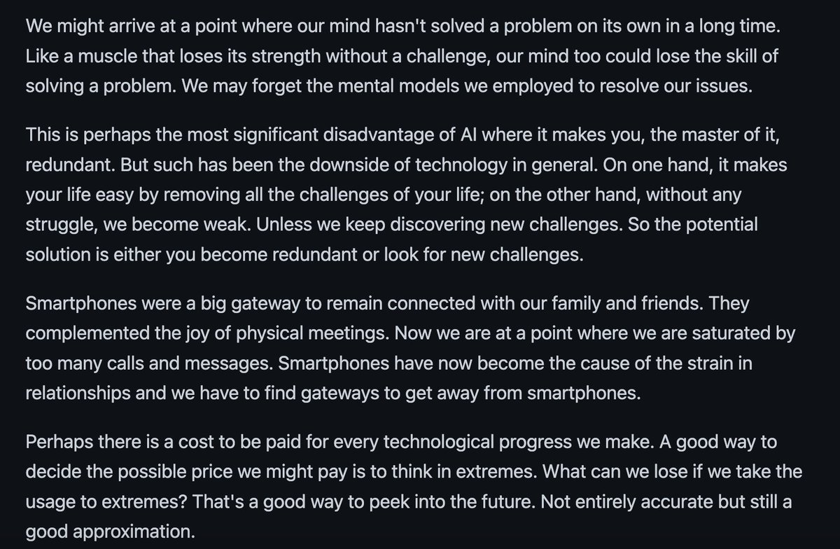 the symptoms are already showing: > people asking ChatGPT "what should i eat for breakfast?" > students letting AI write their thoughts instead of developing their own > entrepreneurs asking AI to make business decisions they should be making sound familiar? it's the same
