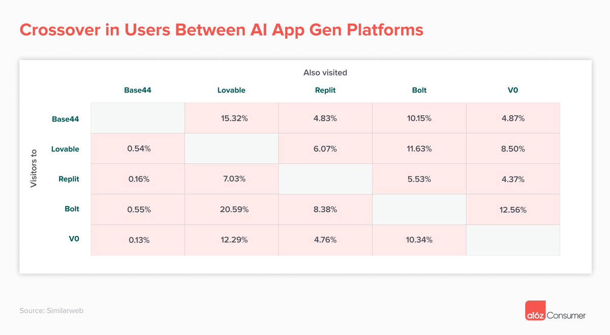 This crossover in app gen tools shows in web traffic overlap data - what % of site X's users visited site Y? Two user types emerge: (1) Loyalists who prefer the UI, features, etc. of one platform (e.g. 82% of Replit users are only on that platform) (2) Power users active