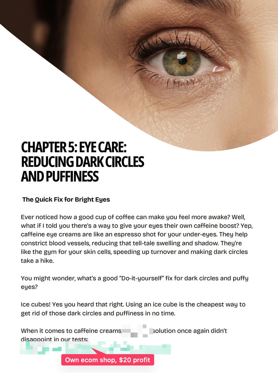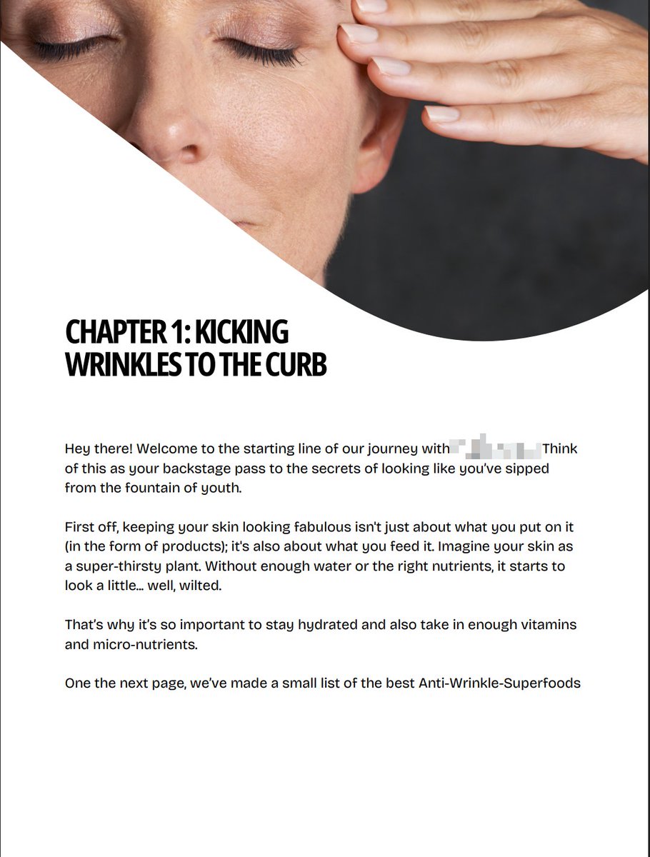 Now here’s how I structured it Each chapter = 1 problem of aging Real info first, then soft pitch I marked all payouts Let’s go Chapter 1: Aging Skin Biggest pain point You cover 3 angles 1. From the inside (supps) 2. From the outside (serums) 3. From the outside (gadgets)