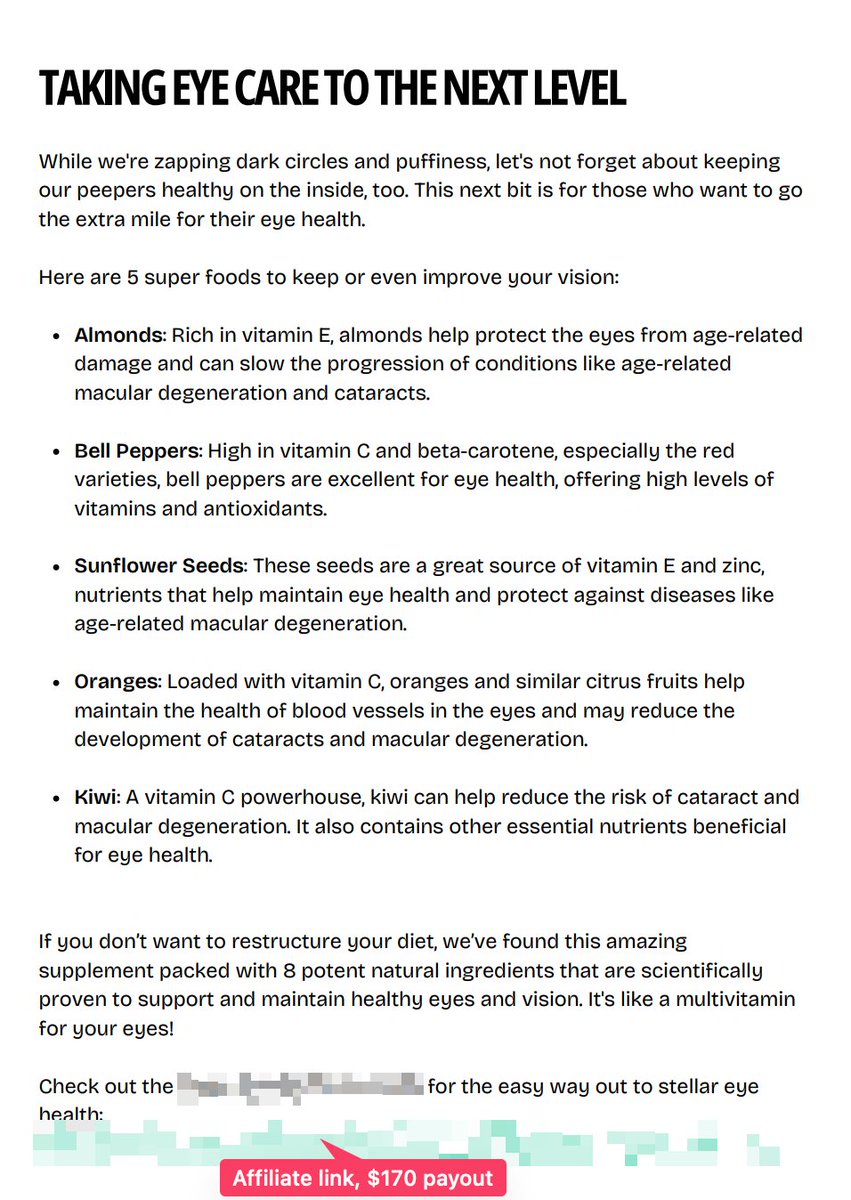 Make it seem like they can achieve results WITHOUT buying anything. But after every section of real info You show the “easy way out” > affiliate links (nutra always hits) OR > links to a 2nd shop you run. That's the MAIN key