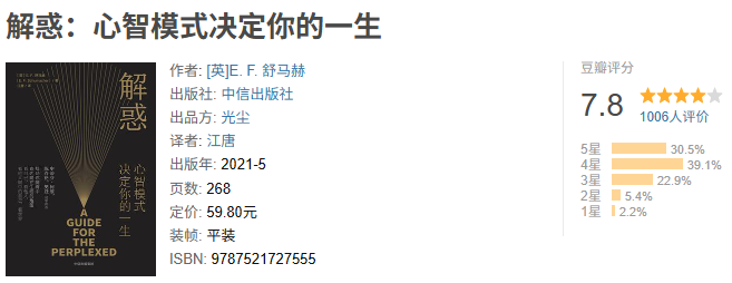 生活在这世界上,每个人都是初来乍到的旅行者。若手中拿着的地图是错误的,要人们如何抵达想要的生活? 舒马赫在这本书中告诉我们,人生中一些看似无解的痛苦和烦恼,其答案一定来自更高的层次,而解决问题最有效的方法,就是心智的跃迁。 评论区阅读📖《解惑》👇