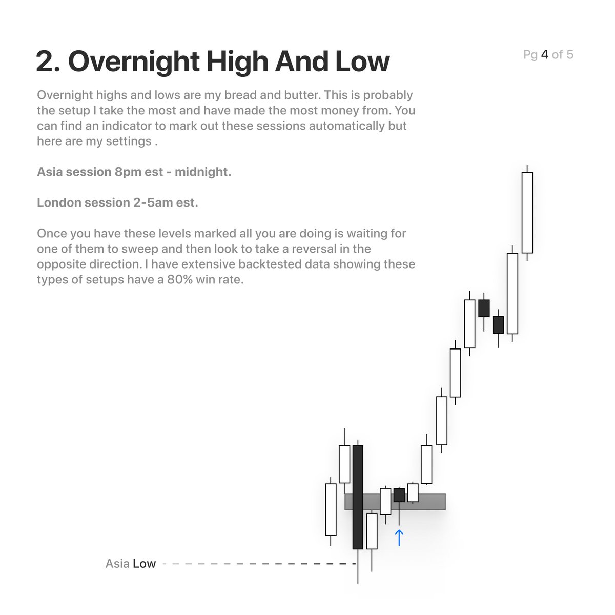 Overnight highs and lows are my bread and butter. This is probably the setup I take THE MOST and have made the most money from. You can find an indicator to mark out these sessions automatically but here are my settings . Asia session 8pm est - midnight. London session 2-5am