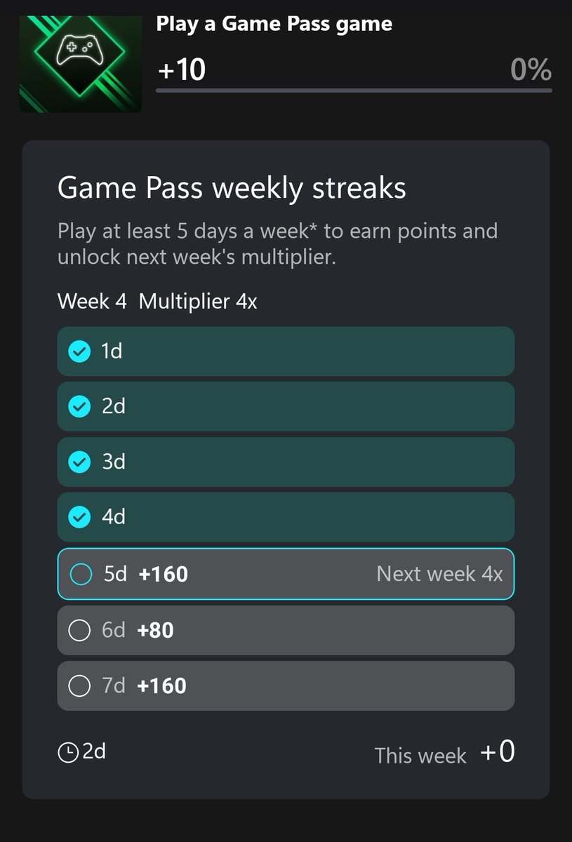 @RewardsSupport For me, the quests on Xbox are not scored. Playing a game on console and playing a Game Pass game doesn't count for me