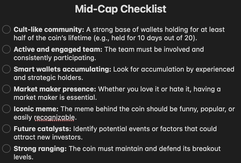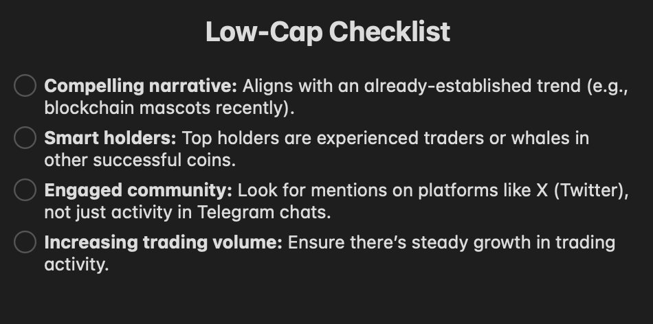4 / $1M ā $100M: This is where things get tricky. For a token to make this leap, everything has to align perfectly. One misstep, and the run could come to a halt. So, how do you spot a potential $100M token? Hereās the checklist you need š