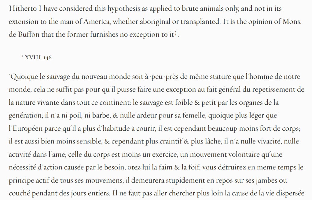 The real rub of the claim, though, was Bufon's "extension [of it] to the man of America, whether aboriginal or transplanted." "The savage is weak and small in sexual organs; he has neither hair nor beard and no ardor for women... much less strong in body... more cowardly."