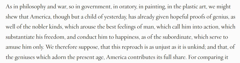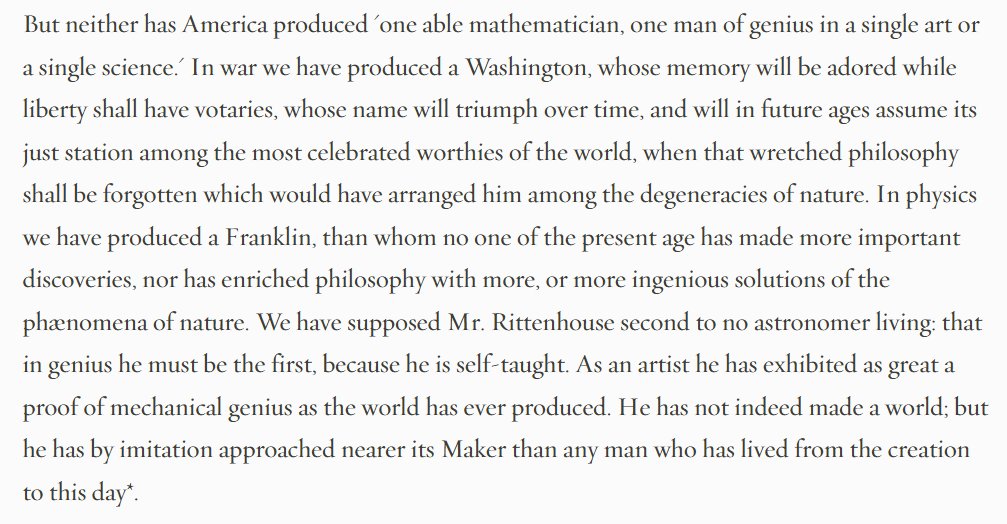 "Of the geniuses which adorn the present age, America contributes its full share" β Thomas Jefferson, Notes on the State of Virginia (1785)